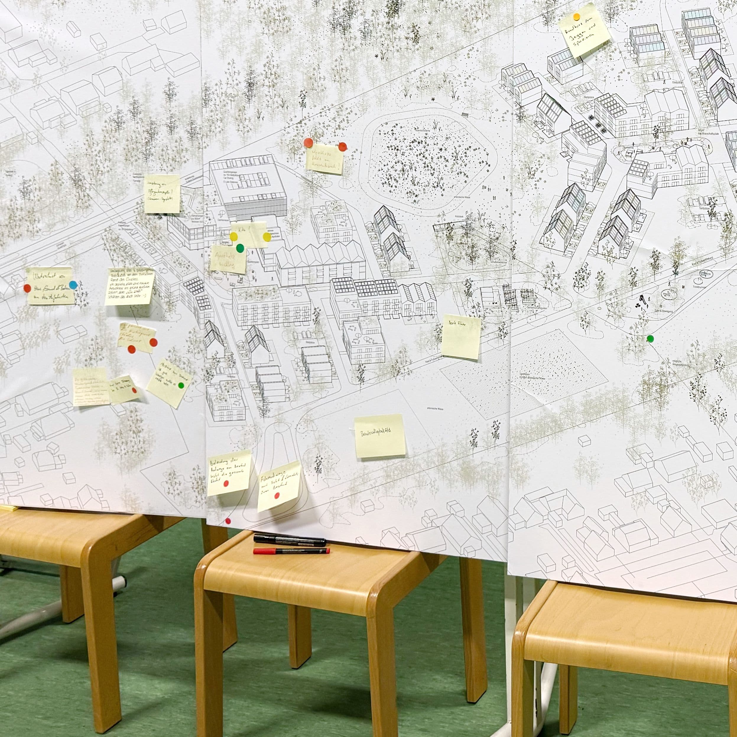 Die erste Werkstatt diente der Sammlung und Bündelung von Anliegen, Hinweisen und Erwartungen. In der zweiten Werkstatt wurde der weiterentwickelte Planungsstand zurückgespiegelt und gemeinsam vertieft. Dabei zeigte sich, wie konkrete Beiträge – etwa zu Freiraumqualitäten, Naturbezug, Verkehrsführung oder Übergängen zum Bestand – in den Entwurf eingeflossen sind. Gleichzeitig konnten Zielkonflikte offen benannt und konstruktiv diskutiert werden.